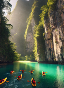 Enjoy lunch on board featuring fresh seafood, with opportunities for kayaking or swimming. Limestone formations rising from turquoise waters create a dreamlike setting. Overnight on board in a comfortable cabin, gently rocked by the sea.